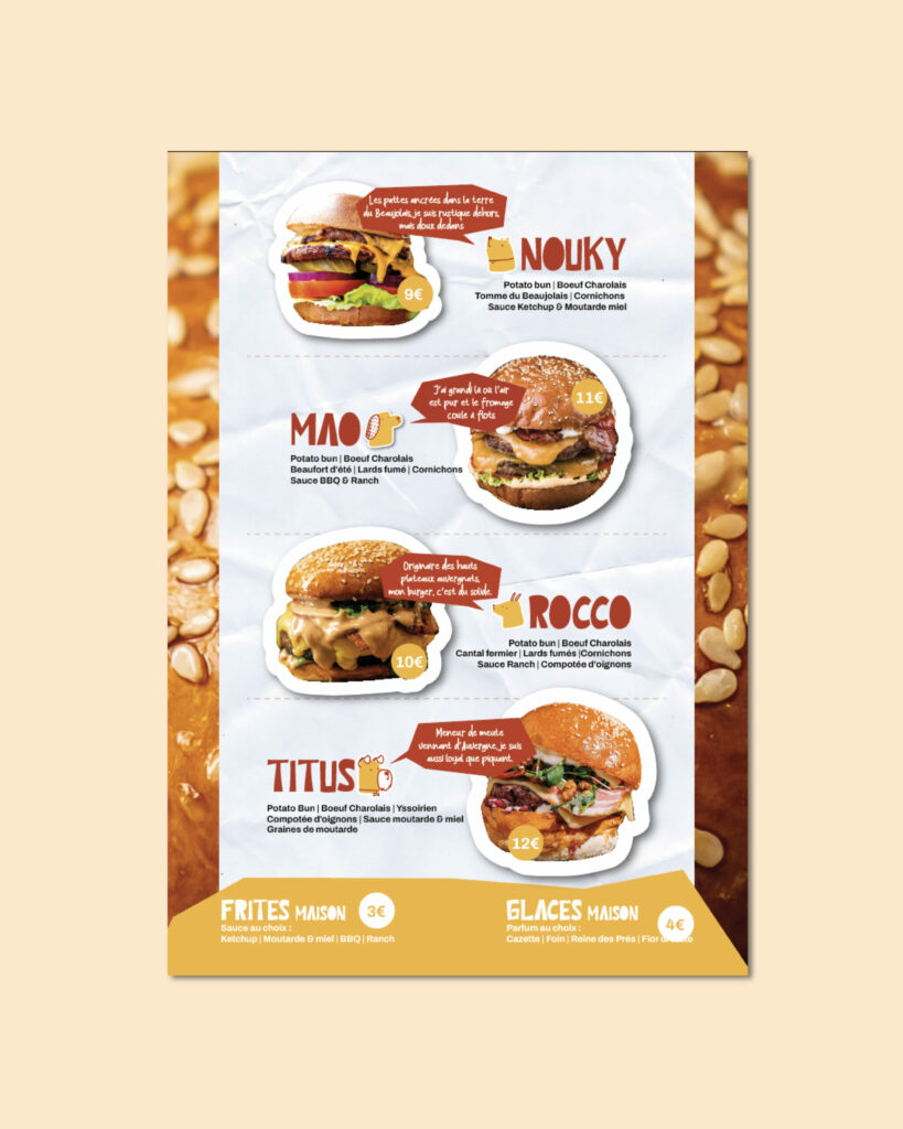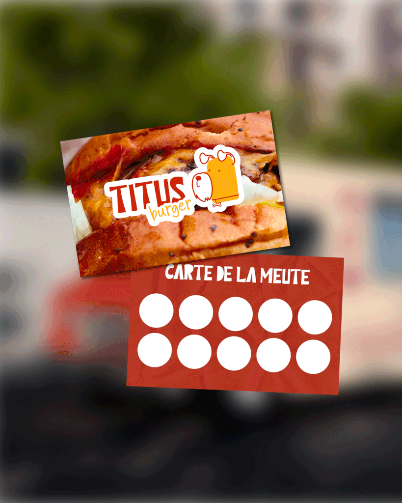 Nous avons également travaillé les menus, où chaque burger arbore fièrement son nom de chien, ainsi que les cartes de visite et les cartes de fidélité. Les cartes de visite ciblent les professionnels et partenaires potentiels, pour des opportunités de partenariat à la hauteur du positionnement du chef. Les cartes de fidélité s’adressent directement aux clients, pour fidéliser les gourmets et construire une vraie communauté autour de Titus.